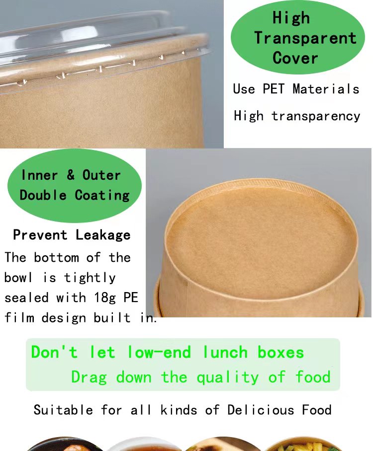 Bol en papier kraft jetable à prix d'usine Soonn avec couvercles pour salade/nouilles/pot chaud/soupe/dessert et autres emballages alimentaires.​