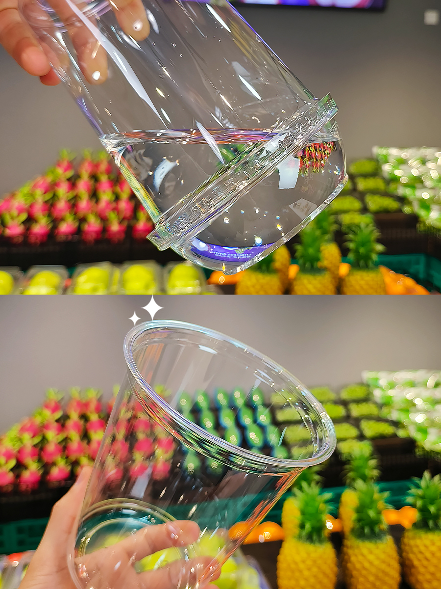 1. Haute qualité clairement : le gobelet en plastique est fabriqué en matériau PET dans son ensemble, avec une transparence élevée et une esthétique forte.
