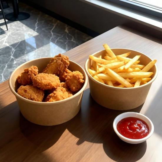 Bols en papier alimentaire jetables de bonne qualité avec couvercles, ils ont la meilleure propriété d'étanchéité et adoptent du papier kraft et blanc d'épaisseur, diverses spécifications et tailles peuvent répondre à vos différents besoins.​